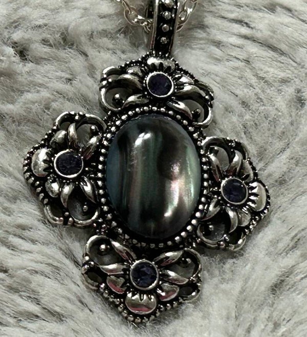 This elegant piece features a finely crafted silver chain paired with a striking ornate pendant. At the heart of the pendant rests an oval cabochon stone, showcasing natural swirls of deep gray, black, and soft silver-green tones—giving it a mysterious, almost ethereal glow. Surrounding the centerpiece are four sparkling crystal accents, each delicately set into intricate vintage-inspired silver filigree patterns, forming a cross-like design that exudes timeless sophistication.